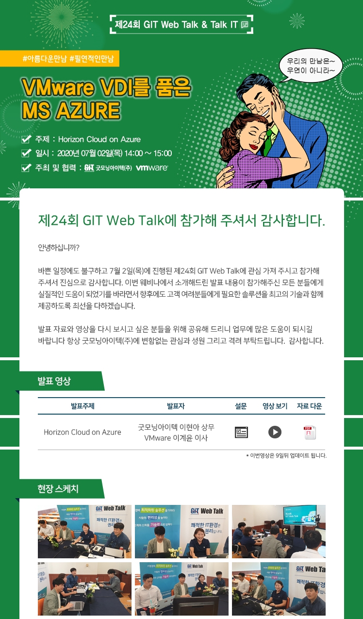 안녕하십니까? 바쁜 일정에도 불구하고 5월 7일(목)에 진행된 제18회 GIT Web Talk에 관심 가져 주시고 참가해 주셔서 진심으로 감사합니다. 이번 웨비나에서 소개해드린 발표 내용이 참가해주신 모든 분들에게 실질적인 도움이 되었기를 바라면서 향후에도 고객 여러분들에게 필요한 솔루션을 최고의 기술과 함께 제공하도록 최선을 다하겠습니다.