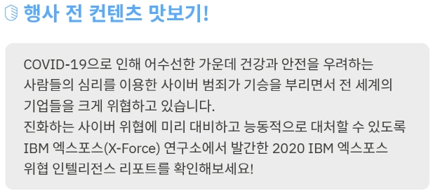 예측할 수 없는 미래와 증가된 보안 위협, 코로나19의 경제 여파로 모두가 어려운 지금, 한국IBM에서는 고객분들께 조금이라도 도움이 되고자 '뉴노멀'에 대비한 최신 보안 기술을 무료로 경험할 수 있는 기회와 보안 트렌드 및 현 위기를 잘 극복한 기업들에 대한 베스트 프렉티스를 공유하는 장을 마련하고자 합니다.