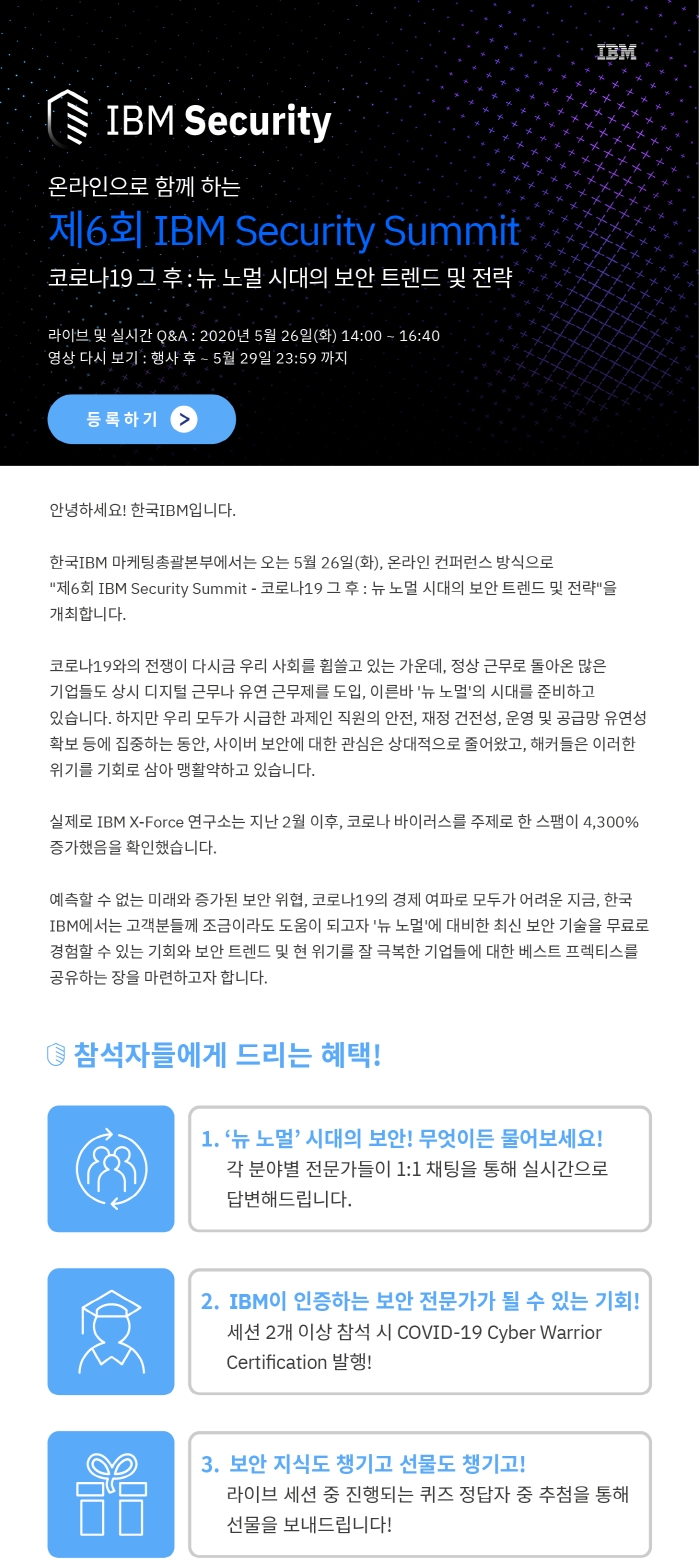 안녕하세요! 한국IBM입니다. 한국IBM 마케팅총괄본부에서는 오는 5월 26일(화), 온라인 컨퍼런스 방식으로 "제6회 IBM Security Summit - 코로나19 이후 : 뉴노멀 시대의 보안 트렌드 및 전략"을 개최합니다.