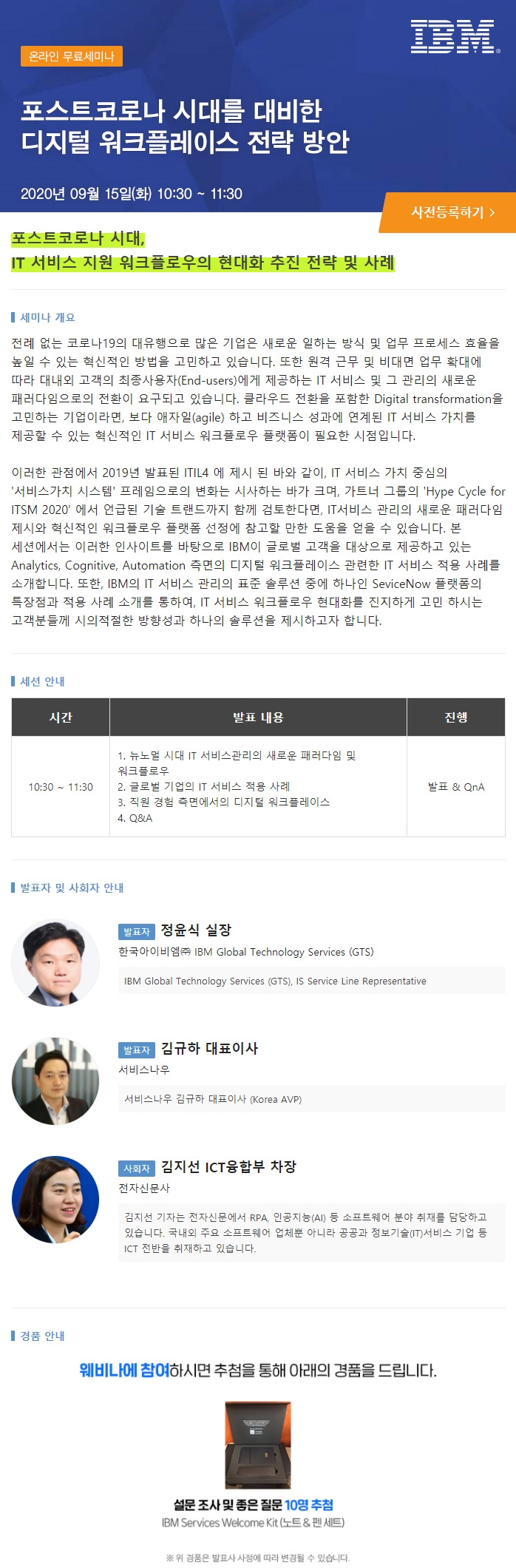 • 발표자: 정윤식 실장 / 한국아이비엠㈜ IBM Global Technology Services(GTS), 김규하 대표이사 / 서비스나우