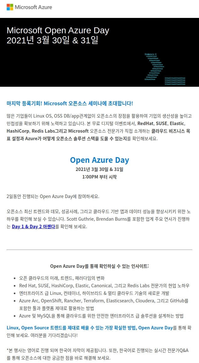 Linux, Open Source 트렌드를 제대로 배울 수 있는 가장 확실한 방법, Open Azure Day를 통해 확인해 보세요. 여러분을 기다리겠습니다!