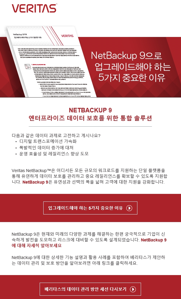 NetBackup 9에 대한 상세한 기능 설명과 활용 사례를 포함하여 베리타스가 제안하는 데이터 관리 및 보호 방안을 알아보려면 아래 링크를 클릭하세요.