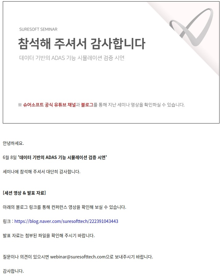 안녕하세요. 6월 8일 '데이터 기반의 ADAS 기능 시뮬레이션 검증 시연' 세미나에 참석해 주셔서 대단히 감사합니다.