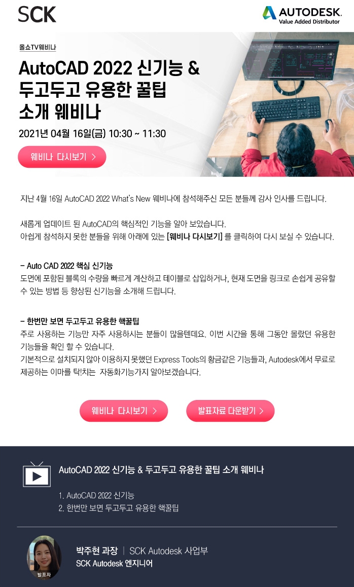4월 16일 SCK에사 진행한 AutoCAD 2022 신기능 & 두고두고 유용한 꿀팁 소개 웨비나 발표자료와 다시보기입니다.