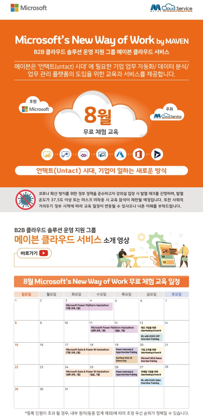 마이크로소프트 클라우드 솔루션(Microsoft Azure, Microsoft 365, Dynamics 365, DW & Power BI) 전문 컨설팅 기업 메이븐 관계 교육 법인인 메이븐 다이나믹러닝 교육센터에서 2021년 8월에는 Power Automate & Apps Overview Training 업무 프로세스 자동화 앱 개발 과정, Microsoft Power Platform Hackathon 업무 자동화(RPA) 및 어플리케이션(App) 개발 교육 및 실습, 일반/제조/리테일 기업을 위한 Data Modeling & Power BI Overview Training 데이터 모델링 및 보고서 개발 과정, Microsoft Data & Power BI Hackathon 경영 보고서 BI 개발 교육 및 실습, Microsoft 365 & Teams Overview Training 클라우드 협업 시스템 사용자 과정, Machine Learning with Dynamics 365 CDP Overniew Training 머신러닝을 활용한 고객 데이터 예측 분석 과정, Machine Learning with Dynamics 365 Sales Overview Training 머신러닝을 활용한 영업 데이터 예측 분석 과정, Surface Hub 2S Demo Day Office 365 기반 스마트 오피스 디바이스 체험 교육을 진행합니다. 선착순 마감으로 등록이 진행되오니, 서둘러 등록하시어 강의에서 찾아뵙길 바랍니다.