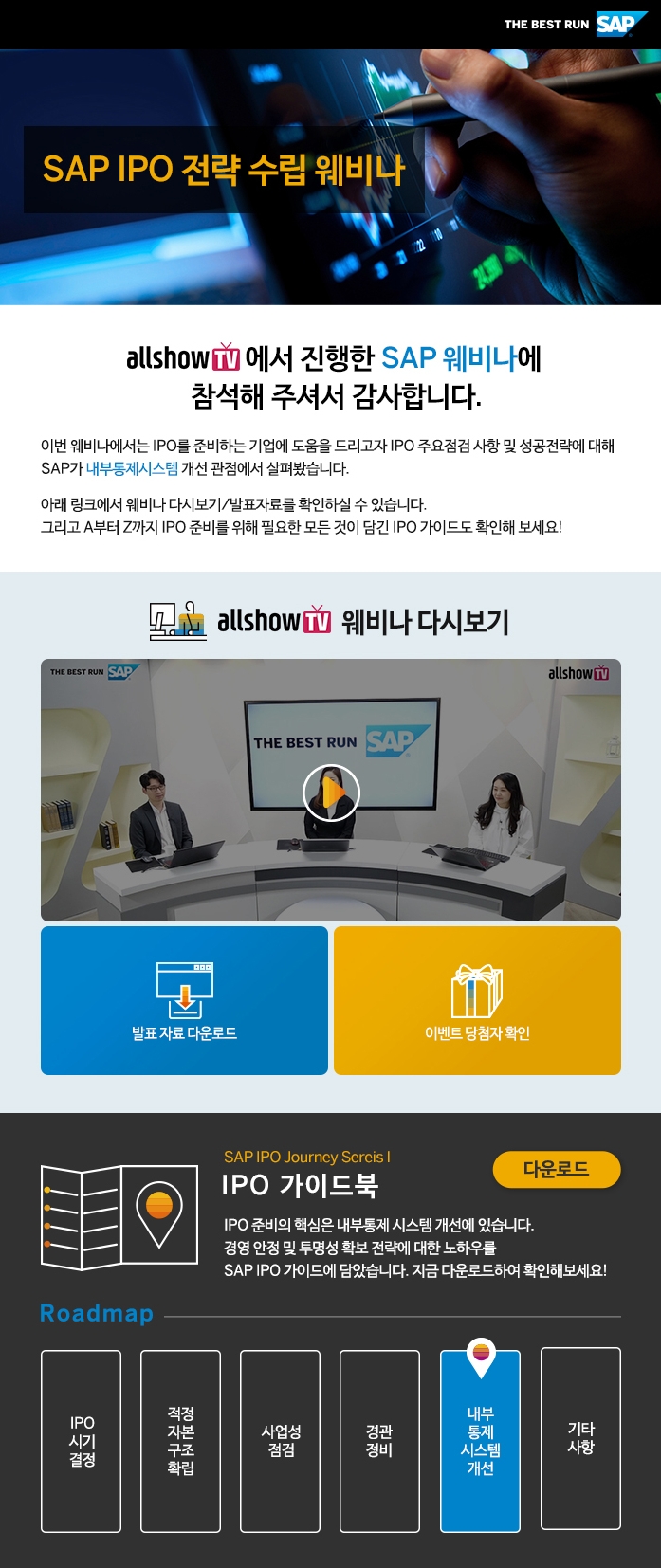 이번 웨비나에서는 IPO를 준비하는 기업에 도움을 드리고자 IPO 주요점검 사항 및 성공전략에 대해 SAP가 내부통제시스템 개선 관점에서 살펴봤습니다.