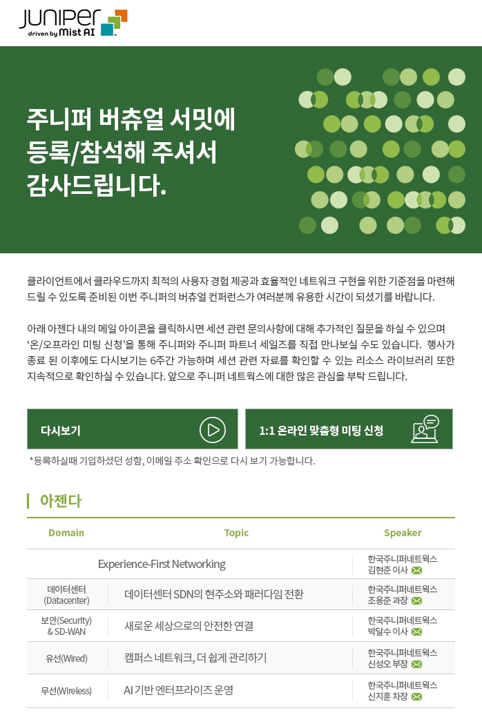 아래 아젠다 내의 메일 아이콘을 클릭하시면 세션 관련 문의사항에 대해 추가적인 질문을 하실 수 있으며 '온/오프라인 미팅 신청'을 통해 주니퍼와 주니퍼 파트너 세일즈를 직접 만나보실 수도 있습니다. 행사가 종료된 이후에도 다시보기는 6주간 가능하며 세션 관련 자료를 확인하실 수 있는 리소스 라이브러리 또한 지속적으로 확인하실 수 있습니다. 앞으로 주니퍼 네트웍스에 대한 많은 관심을 부타득립니다.