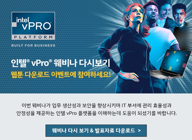 이번 웨비나가 업무 생산성과 보안을 향상시키며 IT 부서에 관리 효율성과 안정성을 제공하는 인텔 vPro 플랫폼을 이해하는데 도움이 되셨기를 바랍니다.