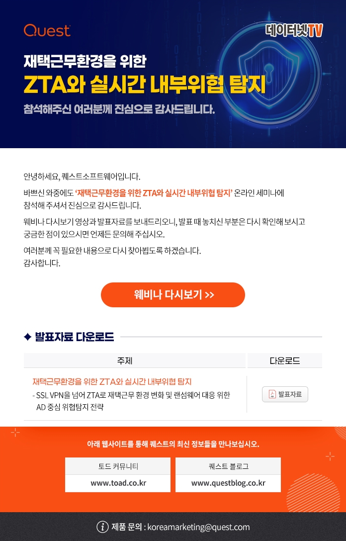 안녕하세요, 퀘스트소프트웨어입니다. 바쁘신 와중에도 '재택근무 환경을 위한 ZTA와 실시간 내부위협 탐지' 온라인 세미나에 참석해 주셔서 진심으로 감사드립니다.