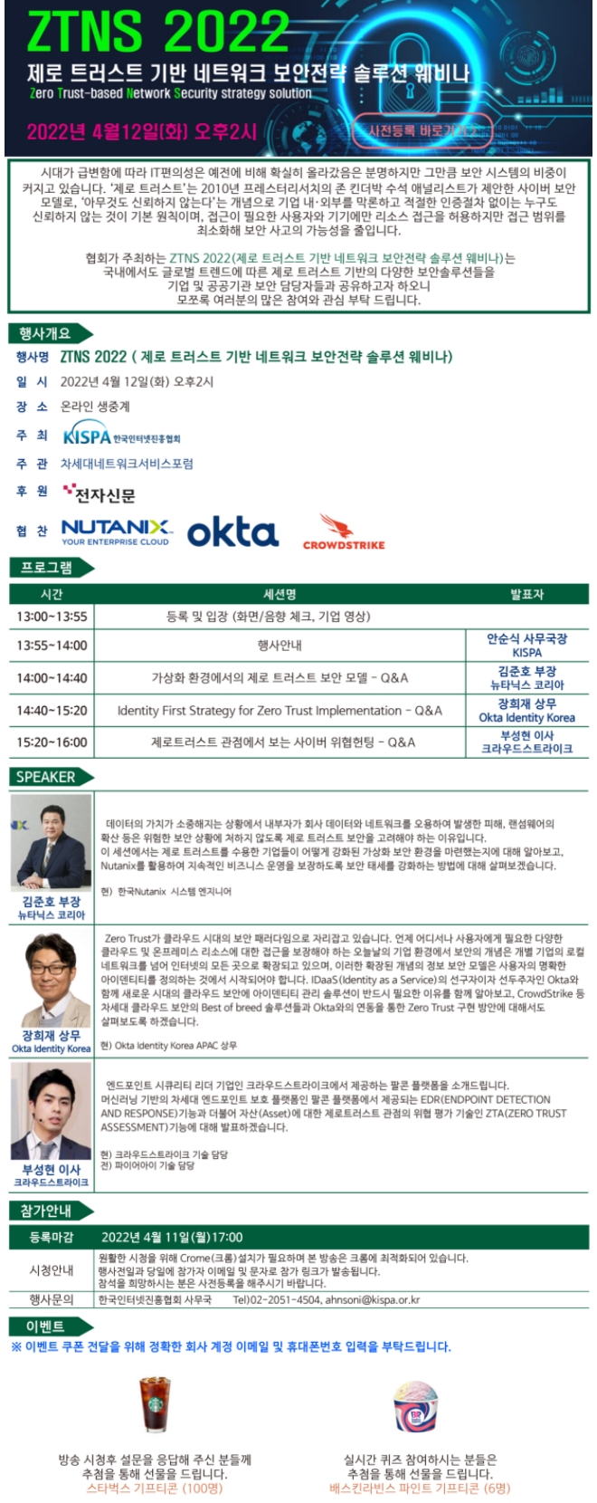 협회가 주최하는 ZTNS 2022(제로 트러스트 기반 네트워크 보안전략 솔루션 웨비나)는 국내에서도 글로벌 트렌드에 따른 제로 트러스트 기반의 다양한 보안솔루션들은 기업 및 공공기관 보안 담당자들과 공유하고자 하오니 모쪼록 여러분의 많은 참여와 관심 부탁드립니다.