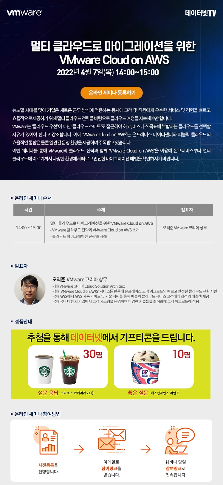 이번 웨비나를 통해 VMware의 클라우드 전략과 함께 ‘VMware Cloud on AWS’을 이용해 온프레미스부터 멀티 클라우드에 이르기 까지 다양한 환경에서 빠르고 안전한 마이그레이션 해법을 확인하시기 바랍니다.