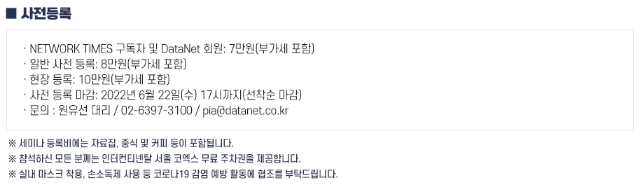 • 일시: 2022년 6월 22일(목) 09:00~17:40 (중식 및 커피 포함)