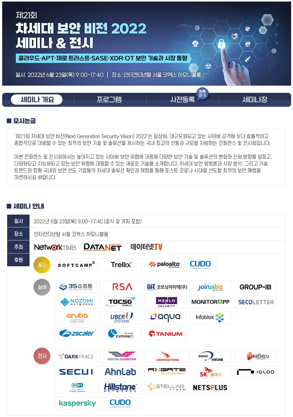제21회 차세대 보안 비전 2022 세미나 & 전시 등록하기