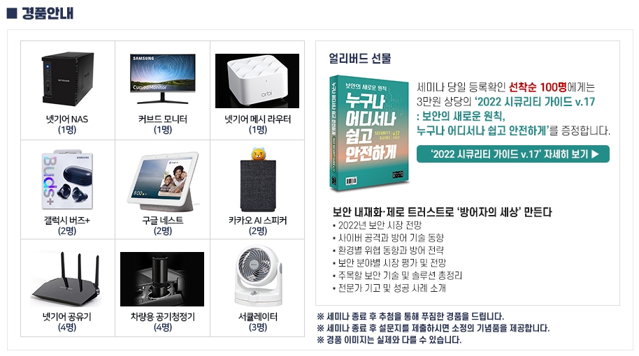 세미나 당일 등록 확인 선착순 100명에게는 3만원 상당의 '2022 시큐리티 가이드 v.17: 보안의 새로운 원칙, 누구나 어디서나 쉽고 안전하게'를 증정합니다.