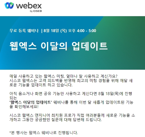 혹시 아직 음소거나 화면 공유 기능만 사용하고 계신다면 8월 18일(목)에 진행되는 <Webex Monthly Update> '웹엑스 이달의 업데이트' 웨비나를 통해 이번 달 새롭게 업데이트된 기능을 확인해보세요!