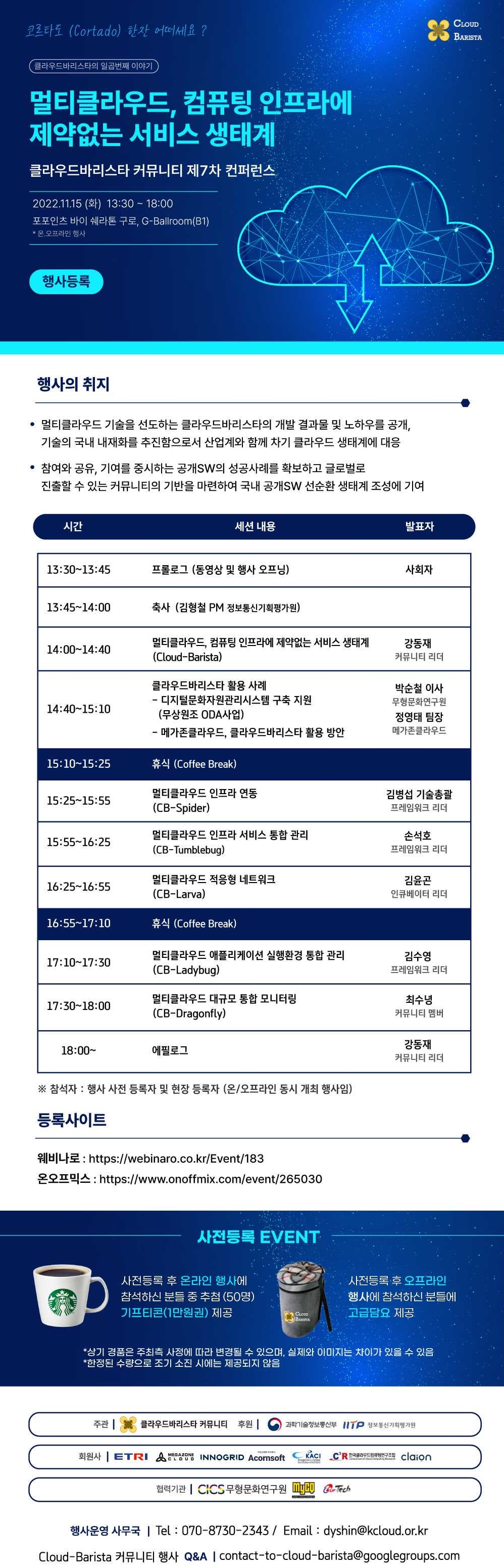 금번 행사는 “멀티 클라우드, 컴퓨팅 인프라에 제약없는 서비스 생태계” 라는 타이틀로 진행되며, Cloud-Barista의 일곱 번째 소스코드 버전인 “코르타도(Cortado)”기술이 소개됩니다. 클라우드바리스타 일곱 번째 행사에 많은 관심과 참여를 부탁드립니다.