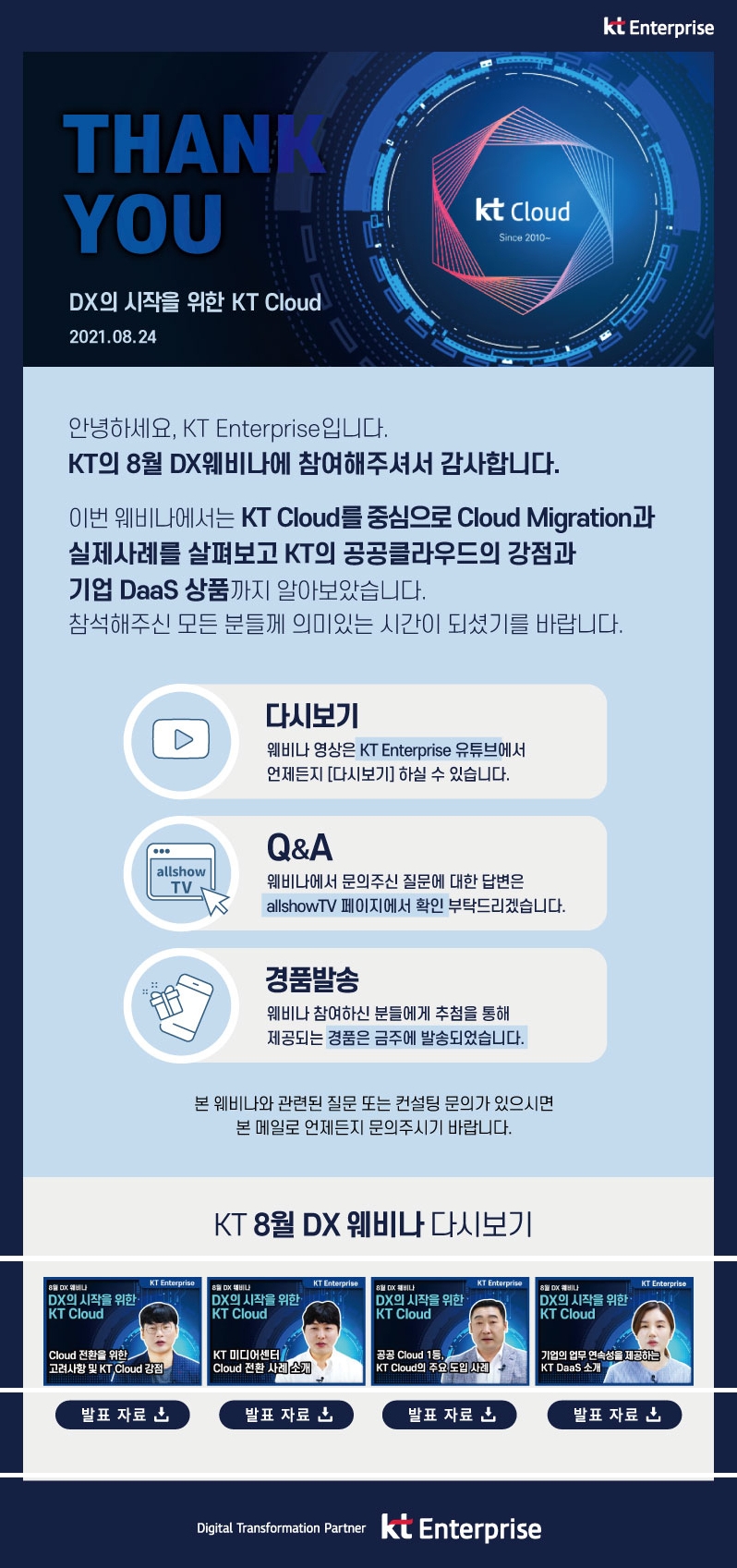 안녕하세요, KT Enterprise입니다. KT의 8월 DX 웨비나에 참여해주셔서 감사합니다.