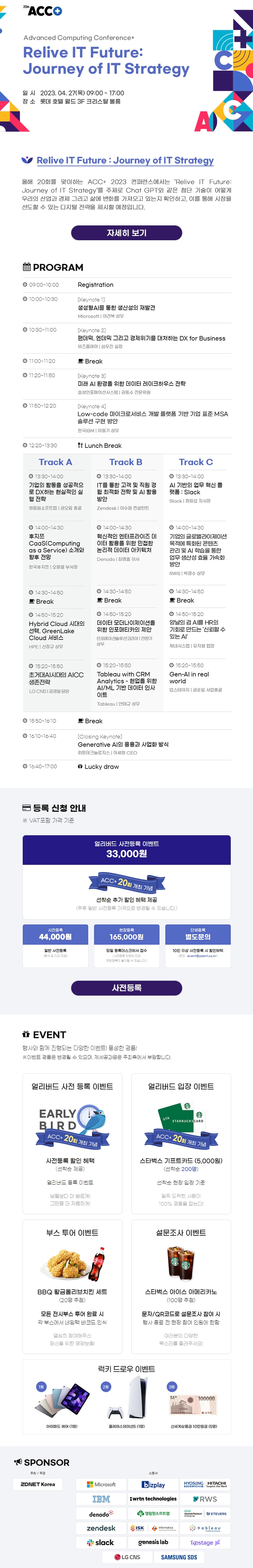 올해 20회를 맞이하는 ACC+ 2023 컨퍼런스에서는 ‘Relive IT Future: Journey of IT Strategy’를 주제로 ChatGPT와 같은 첨단 기술이 어떻게 우리의 산업과 경제 그리고 삶에 변화를 가져오고 있는지 확인하고, 이를 통해 시장을 선도할 수 있는 디지털 전략을 제시할 예정입니다.
