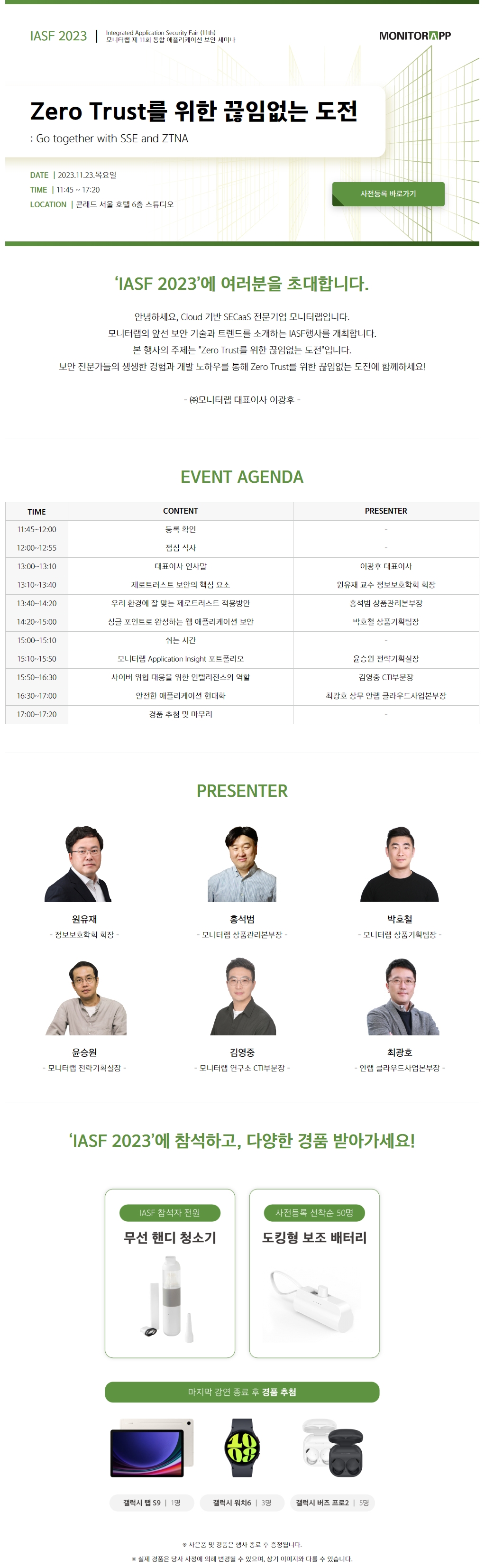 안녕하세요, Cloud 기반 SECaaS 전문기업 모니터랩입니다. 모니터랩의 앞선 보안 기술과 트렌드를 소개하는 IASF행사를 개최합니다. 본 행사의 주제는 "Zero Trust를 위한 끊임없는 도전"입니다.