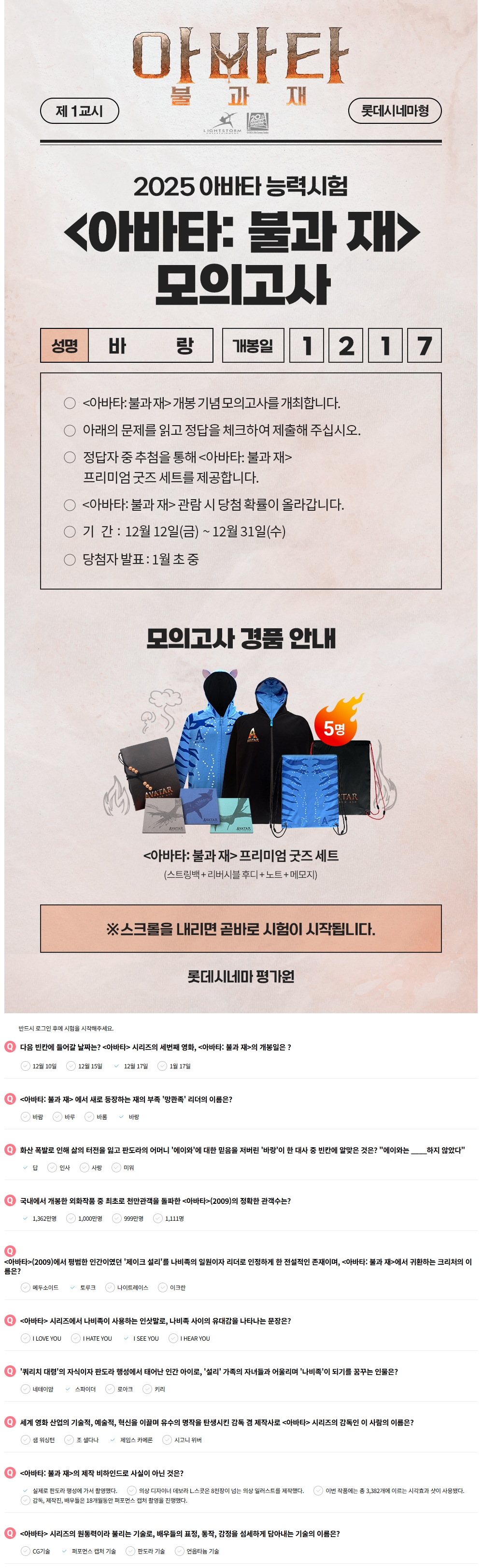 롯데시네마에서 진행하는 영화 이벤트 - 2025 아바타 능력시험 <아바타: 불과 재> 모의고사 문제를 풀어봤으며 정답을 공유합니다.